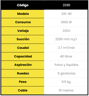 Aspiradora profesional para polvo y líquidos con filtro lavable, capacidad de 40 litros.
