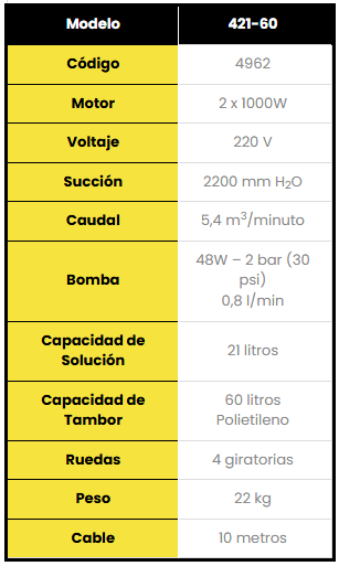 Mayor capacidad y mayor potencia: Capacidad 60 Litros de solución y 21 litros de recuperación. Bomba 48W y dos motores 1000 W cada uno.