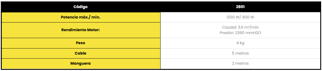 Calienta el aire 25ºC sobre temperatura ambiente sin resistencias, con motor industrial y eficiente de 1200W preparados para la exigencia del trabajo diario en peluquerías caninas, limpieza de tapizados u otros requerimientos de soplado.