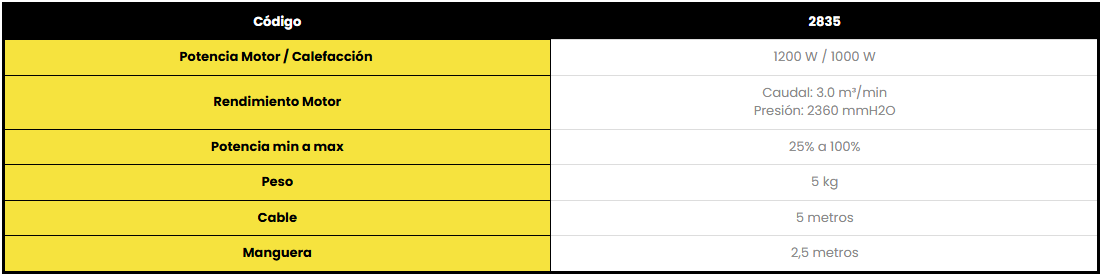 La resistencia se encuentra en un lugar protegido, alejado del agarre de la boquilla, evitando su exposición a golpes y caídas. Posee fusible térmico y ante insuficiente aire (baja el caudal, levanta la temperatura) evita que el calefactor se queme.